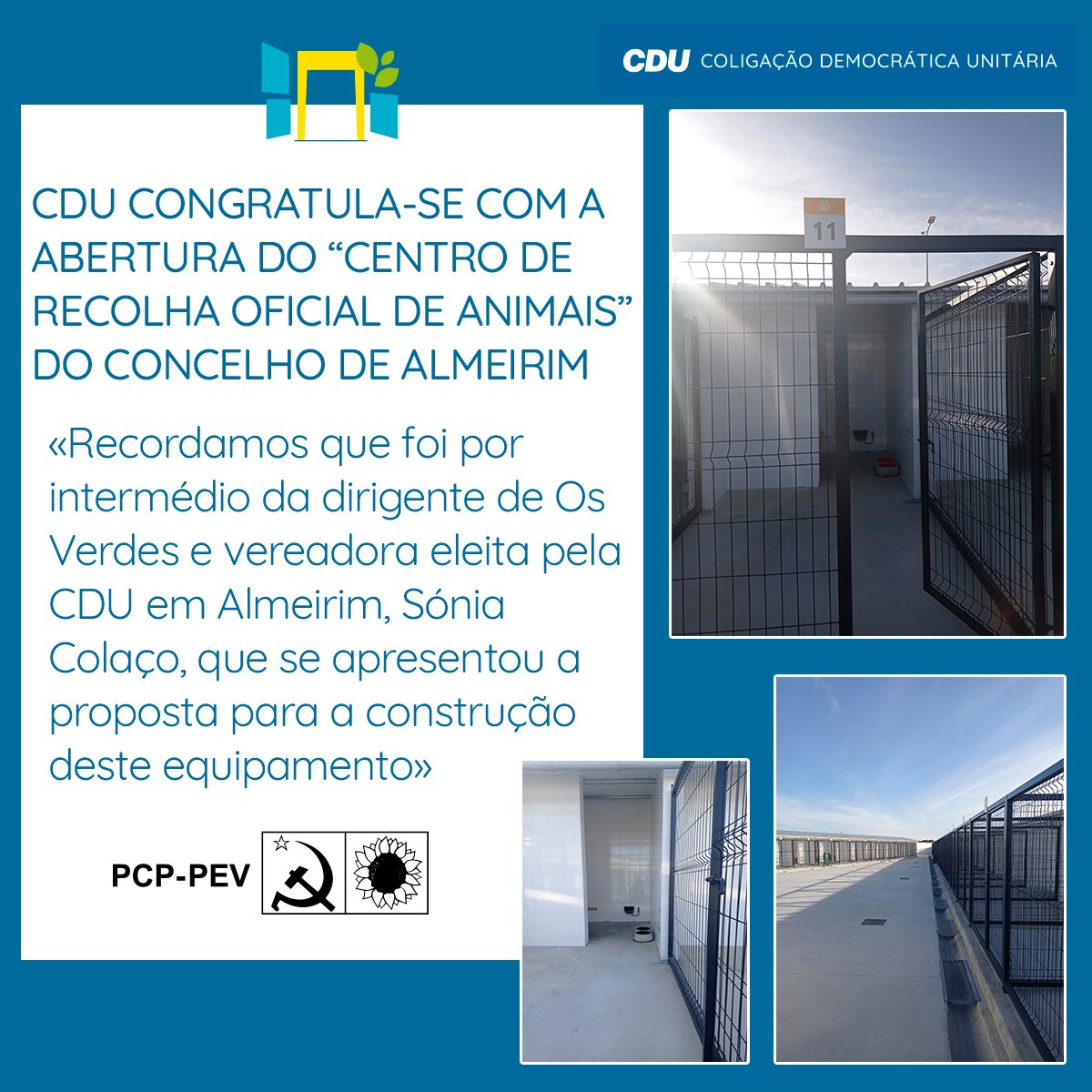 A CDU congratula-se com a inauguração do Centro de Recolha Oficial de Animais em Almeirim, que acontece hoje, dia 21 de Maio de 2021, pois considera que é fundamental que a autarquia seja cumpridora das competências e responsabilidades que a legislação lhe atribui no que diz respeito à proteção, bem-estar e sanidade animal de todos os animais perdidos ou abandonados no concelho.